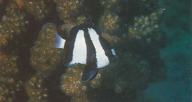 體呈白色並有3條黑帶;腹部黑。最大體長約6cm。棲息於礁池及1-12m之珊瑚礁