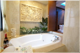 公主床、浴缸、觀景陽台峇里島手工傢俱、峇里島縷空雕花.泡澡泡泡粉.液晶電視.網路寬頻.牙刷.牙膏.大浴巾.小毛巾.肥皂.洗髮乳